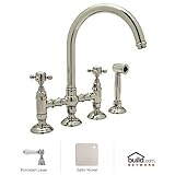 Rohl A1461LPWS-2 Country Kitchen Bridge Faucet with Side Spray and Porcelain Lever Handles, Satin Nickel. Country Kitchen Bridge Faucet with Side Spray and Porcelain Lever Handles Born in the Piedmonte region of France, an area known for its rich tradition of cuisine and culture, the Country Kitchen collection is defined by exquisite design. Straight lines are paired with gentle curves and ribbing details to create a classic look that is as popular today as it was years ago. And with function set as the cornerstone of all Rohl products, rest assured that the beauty of the Country Kitchen collection does not overshadow its use. Smooth handle operation, lifetime ceramic disc valves, and a sturdy feel that only all-brass construction could allow are all defining features of the Country Kitchen collection. As one of Rohl's largest collections, you will find that there are a variety of bold styles and finishes to choose from. Rohl A1461LPWS-2 Features: All brass faucet body construction - weight: 13 lbs. Hand-machined from solid brass stock Industry leading, 1/4 turn lifetime ceramic disc valve Superior finishing process - chemical, scratch, and stain resistant Number of installation holes required: 4 Spout swivels to allow for unobstructed sink access Insulated brass side spray (not plastic) Bridge-style, above the counter mixing valve Center-to-center distance between handle installation holes (faucet centers): 8" 2.2 gallons-per-minute flow rate Installs onto decks up to 2-1/8" thick Porcelain lever handles included Overall height: 13-15/16" (measured from counter top to highest point of faucet) Spout height: 9-3/8" (measured from counter top to faucet outlet) Spout reach: 8-15/32" (measured from center of faucet base to center of faucet outlet) Low lead compliant - complies with federal and state regulations for lead content Designed for use with standard U.S