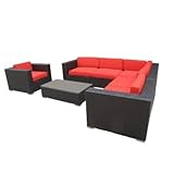 | ✚✚✚ Corona 7 Piece Sectinoal Deep Seating Group with Cushions Fabric: Orange, Finish: White EEI-606 Fabric: Orange, Finish: White Features: -Weather synthetic rattan weave.-Water and UV resistant.-Machine washable cushion covers.-Easy to clean tempered glass top. Includes: -Set includes 1 coffee table, 1 armchair, 2 armless chair, 1 left end section, 1 right end section and 1 corner section. Construction: -Constructed of powder coated aluminum frame. Dimensions: -Seat height: 12".-Back height: 25".-Armrest dimensions: 25" H x 6" w.-Cushion depth: 4".