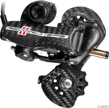 2013 Campagnolo Record 11 EPS Rear Derailleur . Computers and binary code aside, the pride and joy of Campagnolo's new Electronic Power Shift, or EPS, is the Record 11 EPS Rear Derailleur. It represents the vanguard of shifting technology, and is the result of twenty years of research and development by Campagnolo. Elegant, advanced, and precise, the Record 11 EPS Rear Derailleur is a benchmark in component innovation, and is already a must-have for anyone seeking the best. Even Campagnolo naysayers will be drooling upon sight of the Record 11 EPS Rear Derailleur, proving that some things are worth the wait.Simply put, the Record 11 EPS Rear Derailleur is smart. It operates on an electronic actuator comprised of a gear motor and a built-in resolver sensor. The actuator controls a worm screw, in the place of a mechanical spring screw, to move the derailleur. In turn, the actuator's resolver sensor is in constant communication with Digital Tech Intelligence, the brains of the system, charting every movement of the derailleur and positioning it optimally, relative to the cassette. The relationship between the electronic actuator and DTI brings an exciting new feature to EPS: Multi-Shift Technology. The new Multi-Shift enables a shift through all eleven cogs, up or down the cassette, in one compression of the shift lever, and in one and a half seconds. You read that right. To help alleviate the necessity for auto-correction, Campy studied the detrimental effects of vibration on electronic components, and applied tin to the electronic actuator to reduce play. Going even further, Campagnolo engineers bolstered the strength and rigidity of the derailleur by creating a parallelogram carbon fiber derailleur cage with an alloy inner plate. The upper and lower bodies of the derailleur are coated in a techno polymer carbon fiber blend that is both functional and beautifully Campagnolo.The differences between Super Record and Record EPS rear derailleurs are minimal. The Record 11's rear derailleur has a solid parallelogram bo