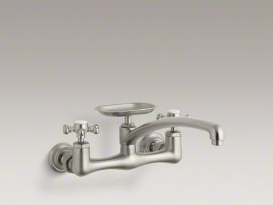 KOHLER K-159-3-BN Antique Wall-Mount Kitchen Sink Faucet, Vibrant Brushed Nickel?Finish/Color:Vibrant Brushed Nickel, Spout:12', Faucet Centers*:8' Widespread (2 holes) Six-Prong Handles Brass Valve Bodies -- Time tested, durable For wall mount installation on 8' centers Solid Brass Construction -- Ensures years of reliable performance Resists scratches, corrosion and tarnishing Lifetime Limited Warranty-Covers function and finish for as long as the original consumer purchaser owns his/her home