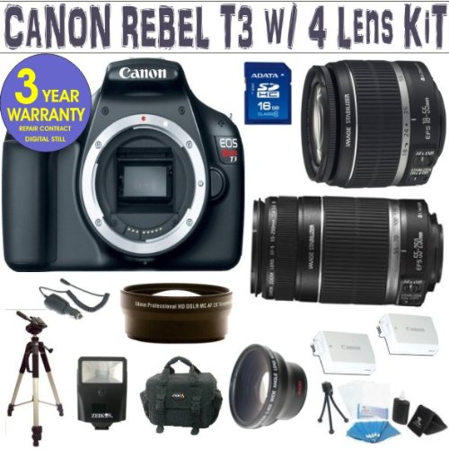BRAND NEW CANON REBEL T3 (EOS 1100D) w/ CANON 18-55 IS LENS + CANON 55-250 IS LENS + .45X WIDE ANGLE LENS + 2X TELEPHOTO LENS + 16GB HIGH SPEED MEMORY CARD CLASS 10 + 3 YEAR CELLTIME WARRANTY try making a full description and product details to find.